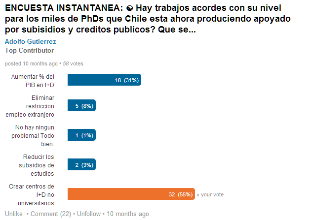 ENCUESTA: Hay trabajos acordes con su nivel para los miles de PhDs que Chile esta produciendo apoyado por subsidios y creditos publicos? Que se debe hacer?
