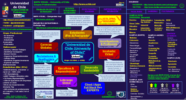 Este mapa, que lamentablemente carga lento, es un intento de capturar la taxonomia de los recursos sociales disponibles para los ex-alumnos de Universidad de Chile en Linkedin, la red social de profesionales mas grande del planeta, La version de alta resolucion es: UChile Linkedin Mapa Visual.